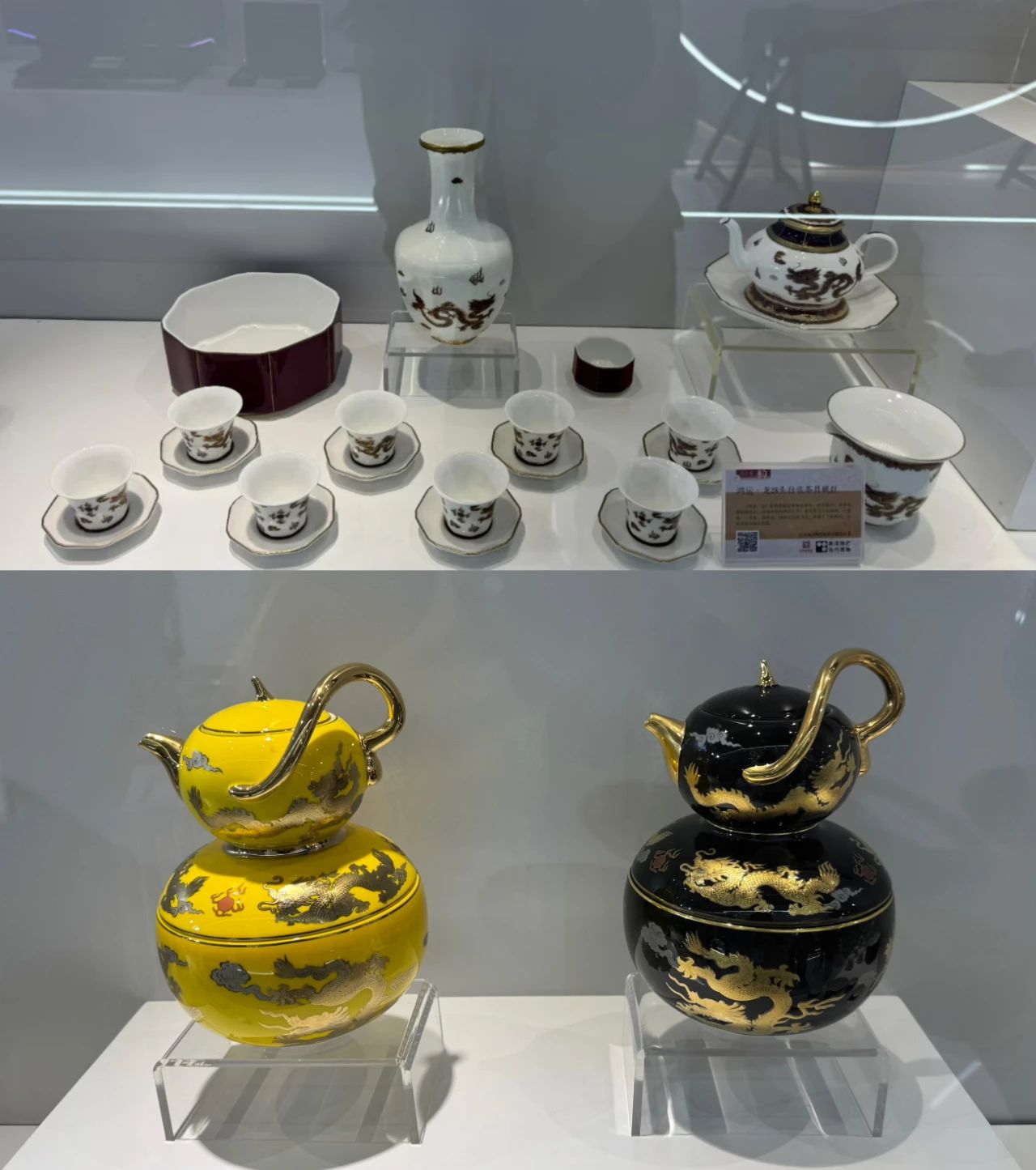 在江苏展厅“首发首秀”板块,由江苏高淳陶瓷股份有限公司带来的“九龙聚福系列茶具”和“鸿运·龙28头白依茶具”两个系列骨质瓷茶具,运用手工描金和特殊珐琅彩工艺,呈现出了传统的中国韵味和当代中国陶瓷工艺的最高标准,既可以是摆件、又可以是茶具,吸引了不少观众驻足拍照。